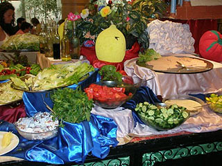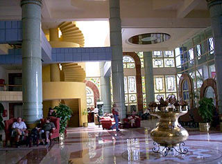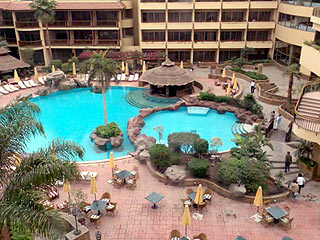 Mi itthon befizettük, iroda azt mondta, hogy náluk be kell, úgy nem tudják elfogadni a jelentkezésünket, ha nem ők veszik a vízumot. Végülis lehet más irodát is keresni, aki ezen akar spórolni, mondták. Benyalta a vízumokat az útlevelekbe és mentünk a pecsételős emberhez útlevélvizsgálatra. Ez 10 perc alatt megvolt, majd csomagfelvétel. Ezután még tettünk egy kis szívességet a tax free–ben a helyi képviselőnek (arabok itt nem vásárolhatnak). Majd irány a busz. Először vacsorázni mentünk, közben találkoztunk a másik helyi idegenvezetővel is, aki egy arab hölgy volt, de elég jól beszélt magyarul, Safyh a neve. A vacsora Kairó Giza negyedében egy elég jó étteremben volt, svédasztalos ellátással, az italt külön kellett rendelni és fizetni. Itt jól jött a dollárból az apró. Majd irány a szálloda, ami a mi esetünkben a Sheraton Royal Garden 5* volt. Magyar viszonyok között én csak négy csillagot adnék neki, mégpedig a tisztaság miatt … De ez igaz a Sea Gullra is, ami így nálam csak 3 csillagra jó magyar mércével nézve. Bejelentkeztünk a szállodába, irány a szoba és alvás.