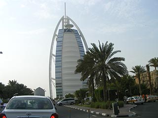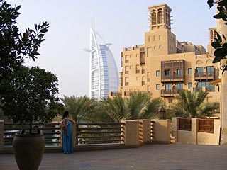 Mindenhol boltok láthatóak, igencsak borsos árakkal. Az épületből helyenként kis sikátorokba ki lehet menni a perzselő kinti forróságba. Az egyik kijáratnál egy 5 csillagos hotelépülethez érkezünk, ahol visszafordítanak, a másik kijáratnál a lagúnát átívelő lépcsős hídon akarunk átkelni, ahol szintén visszafordítanak, mondván az a parkszálloda vendégeinek részre fenntartott privát részbe vezet. A lagúnán 15 perces hajókázás 10.000 Ft. Megkapó látványt nyújt a hagyományos dubai-i építészet széltornyainak látványa, ahogy fölé magasodik a 300 méteres vitorla alakú Burj Al Arab szálloda szimbolikus formája. A pálmafák, a fűszeres illat és a 45 fokos hőség egyedi atmoszférát kölcsönöz a helynek. Pár perc után ismét a légkondicionált bevásárlóközpontba haladunk a mélygarázsban álló kocsink felé.