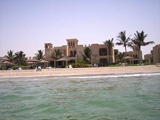 Fujairah városától északra gyönyörű tengerparti út vezet a pár kilométer széles termékeny síkságon. A Hajar-hegység csúcsai felettünk tornyosultak. Helyenként teljesen elkeskenyedett a síkság, és a sziklák közvetlenül a vízben álltak. Az egyik kis síkságon a semmi közepén két luxushotel áll. Az egyik (Le Meridien) mint egy rakétakilövő állomás, olyan magas, és csupa üveg, míg a másik hagyományos arab stílusban épült családias 4-5 emeletes. A kisebb szálloda az a Rotana Fujairah 5 csillagos hotel, amit a magyar utazási iroda is hirdet. A bejárathoz kanyarodva intettünk a portásnak, aki kérdés nélkül beengedett minket. A kocsit a belső parkolóban leállítottuk, és az épületet balról megkerülve egypár Fülöp szigeteki takarító csodálkozó pillantásától övezve a személyzeti átjárón át be is libbentünk a hotel gyönyörűen parkosított, romantikus patakkal, és csobogókkal ékesített kertjébe, melynek közepén ott díszelgett a minden igényt kielégítő 25-28 fokra hűtött vízzel rendelkező medence, partján a beach bárral. A medencét követően a homokos part helyezkedett el, rengeteg trópusi fa ággyal és napernyővel. Érezhetően magasabb színvonalú a szálló mint az Al Hamra, csak mindentől messze van. Szó szerint a semmi közepén. Az óceáni hullámok hatalmasak, és a homokos fövenyen ennek ellenére kicsi rákok százai küzdöttek a hullámokkal minden percben. A mellette lévő Meridien hotel parkja kevésbé pazar, de az épület a jövő évtizedeket idézi. A két hotel tengerpartja közös. A szállodák a környező pusztaságtól kerítéssel vannak elválasztva. 3-4 órát töltöttünk el a hotel kertjében, majd ahogy jöttünk távoztunk. Senki nem szólt érte. 🙂
