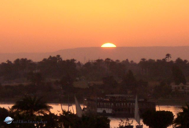 Én nagyon szeretem ezt a „hajós műfajt” minden percét élvezem. Eddig csak tengeren voltam ilyen úton, a Níluson jobb volt. Nem volt hullámzás, csendesen morogtak a motorok, mikor pedig elhúztuk a függönyt, mintha egy élő televíziót néztünk volna. Nem tudtam ezzel a januári csodálatos idővel betelni. Hétágra sütött a nap, a Nílus partján egy zöld sávban élőflóra, pálmafákkal, zöldellő és virágzó bokrokkal, köztük helyenként kis fehér teve tűnik fel. Ráér, néz bele a nagyvilágba. A háttérben már homokdomb, néha egy-egy település, valahol egy kanyargó műút.