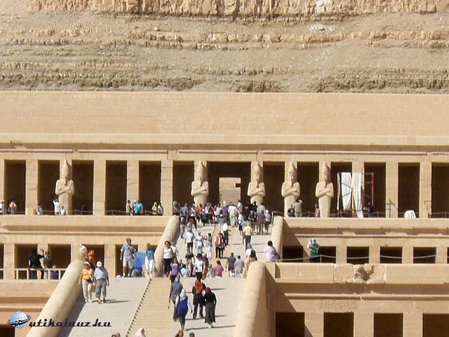 Folytattuk utunkat az alabástrom műhelybe, ami elsősorban azért volt érdekes, mert a semmi ágáról a porból és a lepusztult házak tövéből egy kicsit visszaléptünk Európába. Légkondís bolthelyiség, tiszta padló, friss hideg hibiszkusz tea, WC, mosdó. A délelőtti program utolsó állomása Hatsepszut fáraó temploma, szinte nekitámaszkodva a királyok völgye hátának.