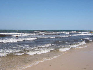 Míg ott voltunk, elég sokat fújt a szél, olyan 40-50 cm-s hullámok is voltak. Sajna ez kihozta a partra a sok hínárt és vízinövény maradványokat, amitől elég sűrű volt a víz. Ha elállt a szél, örömünkre kezdték össze gereblyézni a sok vízinövényt a parton. Szélcsend esetén csodásan tiszta, átlátszó volt a víz.