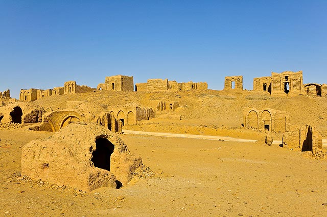 . A sírok kisebb-nagyobb, néhol oszlopokkal díszített, vályogtéglákból épült négyszögletes épületek. Soknak a kupolás teteje már beomlott. Az egyikbe bemegyünk. A mennyezet színes festményekkel díszített, melyek bibliai jeleneteket ábrázolnak. Távolabb két nagyobb templom, illetve bazilika romjai láthatók, melyek a sírok közé épültek. A nagyobbik bazilika teljesen romos, csak oldalfalainak egy része áll, valamint a tetőt tartó oszlopok alapjai látszanak ki a homokból. A másik templom kisebb, jobb állapotban van. Egyhajós belsőterét még félig befedi az egykori mennyezet. Ezért sejtelmes félhomály uralkodik benne. Mellette négyszögletű kis kápolna, belső falain az Exodus jeleneteivel. Sajnos ezek a rajzok gyermetegnek hatnak az ókori egyiptomi falfestményekkel, vésetekkel összehasonlítva, melyek kifinomultságukkal, pontos arányaikkal, fenségességet sugároznak.