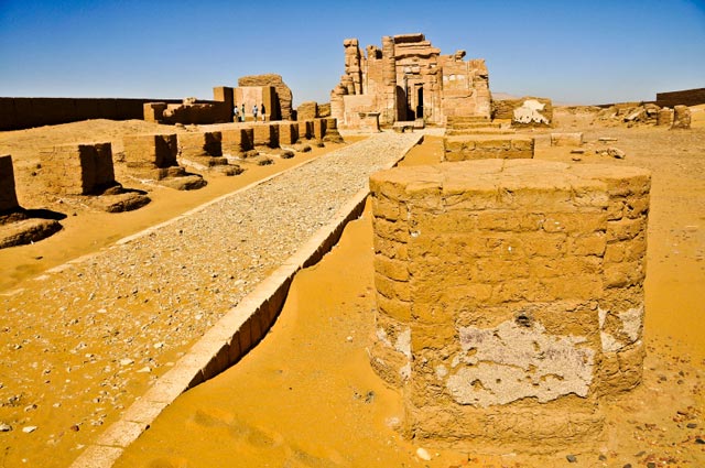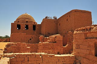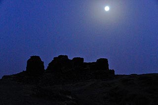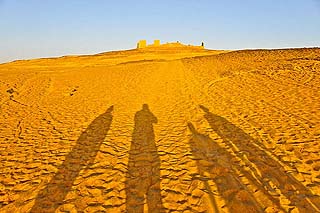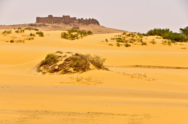 Gyalog indultunk a magaslaton álló romokhoz. A lemenő nap sugarai sárgás-vörösre festették az agyagfalakat. Az erőd különösebben nem érdekes, csak a valamikori templom falain fedezhető fel falvéset, de ezeket lassan a homok és a szél el fogja tüntetni. Az erőd jó helyre épült. Innen a katonák messze elláthattak a sivatagba, illetve szemmel tarthatták az oázist