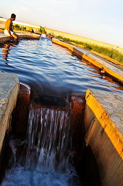 Hagag kitalálta, hogy menjünk fürödni egy forráshoz. Mi nem hoztunk fürdőruhát, így kénytelenek vagyunk rövidnadrágban fürödni. Pár perc autózás után kiérünk egy a termőföldek szélé lévő forráshoz, melynek neve Bir Sitta, azaz hatodik hőforrás. Ez úgy nézett ki, hogy a víz egy jó vastag csövön keresztül ömlik egy nagyobb kerek medencébe, melyből átfolyik egy téglalap alakúba, ahonnan lefolyik egy földalatti vezetékbe, ami a földekhez viszi a vizet. A medencékben a víz derékig ér, aljuk homokos, de nem iszapos. A víz itt is rozsdabarna színű, de amúgy tiszta. Olyan 36-38 fokos. A téglalap alakú medencében még úszni is lehet pár tempót. Tényleg jól esik megmártózni a vízben! A zubogó víz alatt állni, meg olyan érzés, mint bármely élményfürdőben nálunk, csak nem itt nem kell horribilis belépőt fizetni, valamint a hátukat verető nyugdíjasokat kiimádkozni alóla. Klári is bejött a vízbe, igaz ruhástól. A két fiú mindjárt betuszkolta a zubogó víz alá szegényt. A Nap közben leáldozóban volt, a forrás melletti úton sorjáztak haza a dolgozók, közben jól megbámultak minket. Megjelent egy dzsip is, három svájci nővel. Közülük csak egy merészkedett be a medencébe, kettő csak fintorogva a lábát lógatta a vízbe. Hagag persze rögtön szóba elegyedett velük. Azt hiszem női vendégeit igencsak szerethette, és a romokon kívül mást is mutatott nekik. Legalábbis az eddigi sms-ei erről tanúskodtak. Ő jól beszél angolul, de olvasni és írni csak arabul tud, így az egész út alatt én olvastam fel az érkezett üzeneteit, és válaszoltam is a küldőknek. Főleg egy Lizy nevű amszterdami hölgyben hagyhatott mély nyomokat.