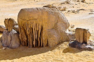 Félórányi autózás után elértük a Kristály hegységet. Már jártunk erre, de akkor elölről közelítettük meg. Így a sivatag felől, érdekesebb arcát mutatja. A homokból egy hatalmas sztalagmit alapja áll ki! Vele szemben a valamikori barlang mennyezetéről lógó sztalaktitok láthatók eltemetve a homokban.