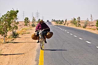 Az út kopár tájon vezet, homok, de inkább kősivatag, leginkább síkság, a távolban futnak csak magasnak látszó hegyláncok. A növényzetet pár tengődő, sárgás fűszál képviseli, melyek elszórtan látszanak a tájban. Hogy miből élnek az rejtély!