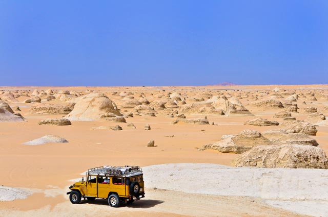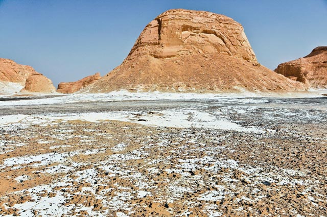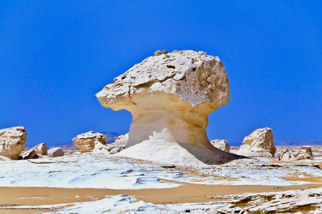A Fehér Sivatag azért kapta a nevét, mivel fehér sziklákból áll, melyeket a szél és a homok évezredes munkája szürreális alakokra koptatott. Némely helyen úgy éreztem, mintha egy Salvador Dali festménybe csöppentünk volna. Három órán keresztül kanyarogtunk a sziklák között. Vezetőnk jól ismerte a helyet. Időnként megálltunk én kiszálltam fényképezni. Ilyenkor rengeteg légy lepett el. A döngésük idegesítő volt, próbáltam elhessegetni őket, de csak jöttek. Ha elindultam elmaradtak, de ha megálltam megint elleptek. Csak Allah tudná megmondani, hogy itt, ahol sem ember, sem állat nem lakik, nincsen olyan hely ahol kis víz, vagy növényzet lehetne, mit keresnek a legyek és ilyen nagy tömegben. Lehet, hogy azért laknak itt, hogy döngésükkel gyorsabb mozgásra serkentsék a fáradt, hőségtől kábult vándort.