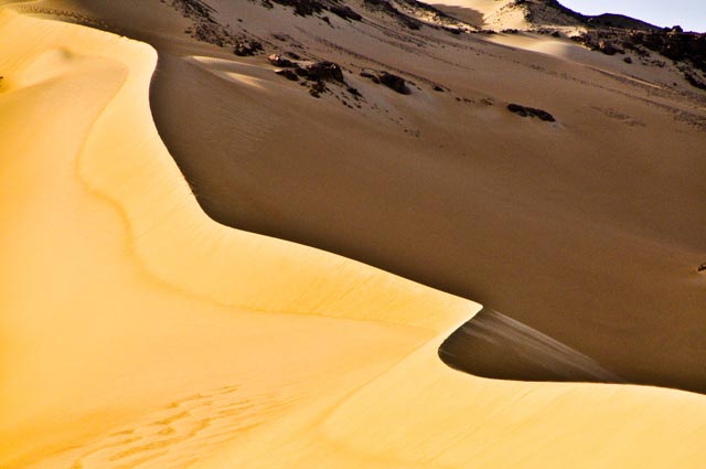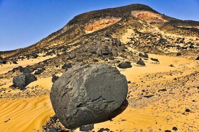 Az úton egy ellenőrző pont áll, két kormányzóság határát jelzi. Itt meg kell állnunk, a rendőrök igazoltatják kísérőinket, hozzánk nem szólnak, csak a nemzetiségünk érdekli őket. Vezetőnk rejtve egy csomag hasist ad át az egyik rendőrnek. A táj egyre sötétebb lesz a vulkanikus kőzetektől. Letérünk az útról, egy hatalmas hegy felé tartunk. A csúcsán, mint orgonasípok állnak a bazaltoszlopok. Óriási bazalt tömbök fekszenek a hegy lábánál, néhol pehelykönnyű fekete kőzetet látni. Ahogy haladunk tovább a feketés szín átmegy sárgásba. Ismét homokon járunk. Felkapaszkodunk egy dűne tetejére. A Nap már alacsonyan jár ezért a dűne gerince élesen rajzolódik ki. Egyik felét még süti a Nap, a másik pedig mélyárnyékba borul.