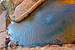 Vezetőnk elkalauzolt minket egy forráshoz. Takaros, kövekkel kirakott medence volt, kifolyással. A medence alján tisztán lehetett látni, ahogy a víz feltör a homok alól. A víz tiszta volt, de meleg és rozsdabarna színű.