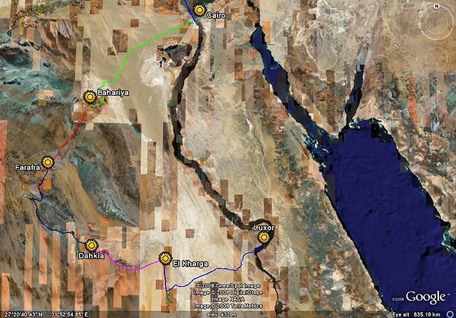 Első célunk Kharga oázis, melyet Luxorral egy újonnan épült út köt össze a sivatagon keresztül. Kharga a legnagyobb a nyugati oázisok közül. Neve arabul kívülit jelent. Kb. 150 km hosszan terül el észak déli irányban a Líbiai sivatagban. Itt található az El Wadi el Gedid kormányzóság központja. Az Új Völgy program keretében az ötvenes, hatvanas években az egyiptomi kormány, hogy a Nílus völgy zsúfoltságát csökkentse, új településeket hozott létre az oázisban, melyek fővárosokról kapták nevüket. A program pénzhiány és a lakosság érdektelensége miatt kifulladt, jelenleg mintegy 60.000 fő él itt.