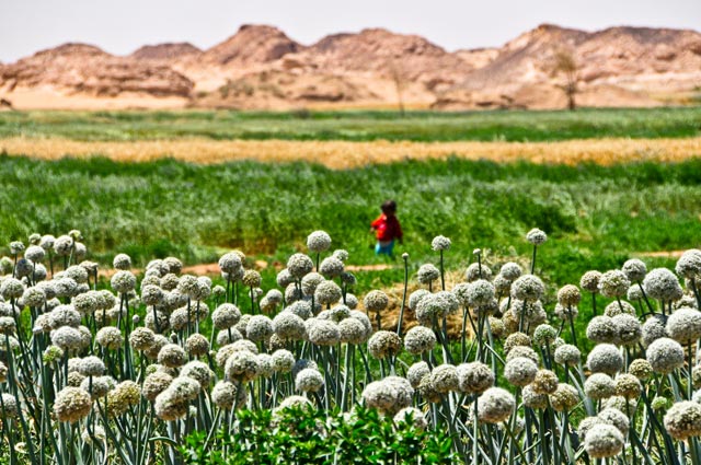 A hetedik ellenőrző pontnál végre elértük Kharga oázis első települését, melyet Bagdadnak hívnak. Jellegzetes egyiptomi falu, poros utcákkal, négyszögletes, fehér vagy vörös téglás, vakolatlan, földszintes, lapos tetős házakkal. Az utcák, déli idő lévén kihaltak. Innen már csak 60 km-t kellett autóznunk El Khragáig, az oázis fővárosáig. Az út Kharga egyetlen útja, észak-déli irányban fut a keskeny oázison keresztül. Jobbra a sivatag be-betör a falvak és a termőföldek közé. A földeken hagyma, zöldség, kevés búza terem. Balra datolyapálmák sűrű erdeje látható. Az egyes földeket pálmalevélből font kerítések választják el egymástól és a sivatagtól. Messzebb a Líbiai sivatag sárga homokhegyei ragyognak a napsütésben.
