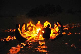 Tüzet raktak, leheveredtünk a homokba. Kellemes idő volt, igaz a levegő is jócskán lehűlt. A tábortüzünk fénye többeket odavonzott. Jött egy motoros fiú, akinek öreg MZ-je prüszkölve kaptatott fel a dűnén, majd később újabb két srác csatlakozott hozzánk egy quaddal, amire Talaat rögtön lecsapott és eltűnt vele. Kisvártatva előkerült száraz fával felpakolva. Az addig alig pislákoló tábortüzünk felélénkült. Előkerült a víz, tea cukor, poharak. Teát főztek, amúgy beduin módra. Közben a telehold ezüstös fénybe borította a tájat. Talaat elvitte egy körre Klárit. Mondtam neki vigyázzon rá, mint a szeme fényére. Klári élvezte az éjszakai quadozást a dűnéken, az volt a baja, hogy a motor csak 150 cm3-is volt, ezért nem volt erős. Letelepedtünk a tűz köré és élveztük a jótékony meleget, amit árasztott magából. Elkészült a tea az első poharat mi kaptuk, hisz mi vagyunk a vendégek. Finom volt, édes és mentás. A srácok halkan beszélgettek, amennyire értettem kocsikról, motorokról folyt a szó. A holdvilágos sivatag, a tábortűz, a tea, a halkan beszélgető fiúk, mind-mind valami végtelen nyugalmat árasztott. Elfejtettem mindent, otthont, gondokat, a szennyes politikai életünket, amivel nap-mint nap borzolják a jóérzésű polgár idegeit. Nem volt más csak mi és ez a tábortűz, a végtelen holdvilágos sivatag. Tényleg megérte, már csak ezért a nyugalomért, csendért érdemes volt ide eljönni! Sajnos minden jó véget ér egyszer, mi is csomagoltunk. Már hajnali kettő óra volt és reggel igazi sivatagi autózás vár ránk az utolsó oázisig, Bahariya-ig.