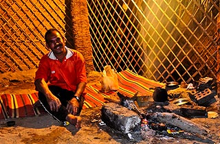 Sötét van, mire lebotorkálunk a kocsihoz, majd elmegyünk egy forráshoz fürödni. Nekünk már tisztán, lezuhanyozva nincsen kedvünk ebben a kacsaúsztatóban pancsolni. Főleg miután megláttuk, hogy néhány helybéli itt mossa le magáról a napi koszt! Hagag és a vezetőnk bemennek a vízbe, mi Talaattal inkább a teakimérésbe húzódunk be. A “teázó” ismét Rejtő Jenőt juttatta eszembe. Pálmafa gerendák tartották a tetőt, melyet pálmalevél borított. A falak gyékényből voltak, a földön szőnyeg. A bejárattól balra ült egy középkorú, szelíd tekintetű, bajszos emberke egy tűz mellett. Ő készítette a teát. A tűzben kormos kanna. Az egész helyiséget egy meztelen villanykörte világította meg. Sem ajtaja, sem ablaka nem volt. Minek is?!