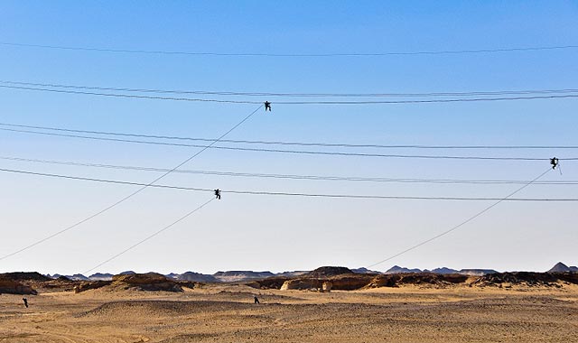 Jó félúton megálltunk pihenni. Az út mellett futó távvezetéket, mely Asszuánból látja el árammal Dahklát, éppen karbantartották. Ez azt jelentette, hogy a távvezeték egy-egy ágán, kis kocsin emberek függnek kb. 20 méterrel a sivatag felett. Valamit ügyködtek a dróton majd az alattuk várakozó egy kötél segítségével arrébb húzza őket. Nem semmi munkahely!