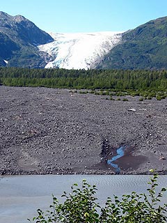 Még nézelödünk egy kicsit aztán indulunk az Exit Gleccserhez hiszen nincs messze, kevesebb mint 10 km. Persze az út végig aszfaltos, a gleccsert pedig jól lehet látni az útról a Ressurection-folyó tulsó oldalán. Mi minél közelebb akarunk menni, így hát be kell térni a bejárati parkoló helyre, mely hatalmas, de igy is alig találunk egy üres helyet. Az úton mikor befordultunk, láttuk, hogy idönként van egy-egy jelzötábla, mindeniken egy négyjegyü szám, 1870, 1896, 1925, 1943, stb. Kezdetben nem tudtuk ezek jelentöségét, de mint kiderült ezek évszámok és jelzik, mikor meddig ért el a gleccser. És ahogy az évszámok nöttek, úgy nött a távolság az útjezötáblák között, jelezvén hogy a gleccser olvadása nagyon felgyorsult.