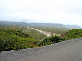 Ahogy az idö telik az esö lassan megáll, a köd felszáll, és az út két oldalán kibontakoznak a hegyek. Az út mentén nyirfa, égerfa, lucfenyö, fennebb már csak bokrok, végül pedig a csupasz sziklák. Sorra keresztezzük a Savage, Sanctuary, Teklanika és az East Toklat patakokat miután feljutunk a Polychrome-kilátóhoz. Megérdemli a nevét, valóban sokszinü a táj, a távolban pedig a  Polychrome-gleccser tünik fel. A kilátás csodállatos, mint ahogy az út is fel, de ugyanakkor kissé félelmetes is. Az út egysávos és meredek gyakori kitérökkel; jobbra a hegyek és nem egy helyen friss omladék, bal oldalon pedig mély szakadék. Ahogy kinéztem az ablakon, nem egy kanyarban csak az alattunk tátongó mélységet lehetett látni, mintha lebegtünk volna a levegöben. Vezetönk meg is mondta, a gyengébb szivüek inkább csukják be a szemüket. Kár hogy a távoli felhök nem oszlottak el, jó lett volna a Denali csúcsot is látni. Végül örvendtem hogy csak a Fish Creek-ig vettünk jegyet, mert egy idö után bármilyen szép is a táj, a képek kezdenek összefolyni, telitödtünk a széppel, már nem érdekel semmi annyira, mint mikor reggel elindultunk. A 8-órás kirándulás is egy maradandó emlékkel gazdagitott.
