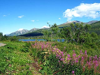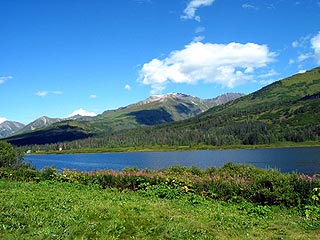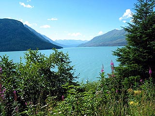 Az idöjósók 70 % esélyt adtak egész hétre az esönek, de ma szerencsére a napsütés 30 % gyözött. Csak nehogy elszóljam magam. A Turnagain-hágó inkább egy nyeregre emlékeztet, s az út bal oldalán egy tóban (Summit Lake) fürdenek a hósipkás hegyek. Útjavitás miatt várunk vagy 30 percet, de van éppen elég miben gyönyörködni. A Trail és Grant tavak balra, rövid idö után pedig jobb oldalon a Kenai-tó smaragdzöld tükre jelenik meg.