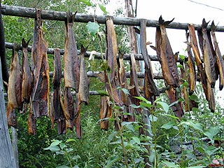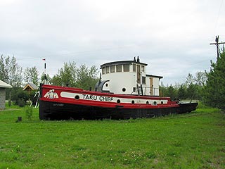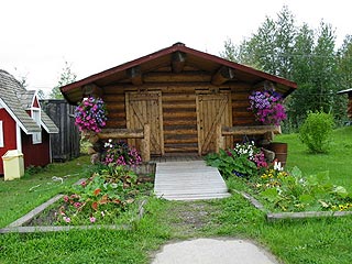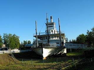 A vendéglö egy hatalmas parkban van, svéd-asztal jellegü, $32-ért ki mennyit tud annyit eszik. A választék nem nagy, elöételnek különbözö saláták, utánna pedig lazac, tökehal és oriás laposhal, sütve illetve rántva és nature bordaszelet. Utánna pedig ha még maradt hely fagyi illetve tortaszeletek között lehet válogatni. Colát és vizet is lehet inni ki mennyit akar, a sörért azonban már fizetni kell, egy pohár $5. Nem olcsó mulatság, a hal azon kivül hogy valószinüleg friss és agyonreklámozott, különben sok íze nincs. Lehet hogy ez már szentségtörésnek tünik Alaszka szempontjából, de az egyik tiszaujvárosi vendéglöben a süllö izletesebb volt. Tudtam hogy Alaszkában nem az inyenc falatokat kell keresni, de hát a jó pap is holtáig tanul. Hogy ülepedjen a sok hal, mert bevallom azért többet ettem mint általában szoktan, jártunk egyet a Pioneer Parkban. Athabaska népmüvészeti múzeum, vasút-múzeum, régi gözkotrógép, a partra húzott Nenana lapátkerekü gözös mely 1933 és 1956 között a Chena folyón müködött.