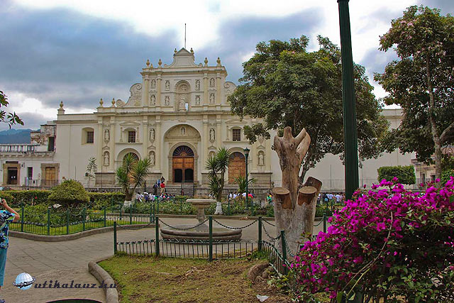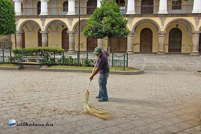 Buszunk a jádéüzlet/múzeum előtt áll meg, mely egyben műhely is ahol az ékszereket gyártják; innen már közel van a városközpont. Nem valószinü hogy véletlen lenne az egybeesés, de míg egyesek vásárolnak, mi nekiindulunk várost nézni. A város központja a Parque Central csak vagy három utca távolságra van, de az út nem unalmas. A házak egyszintesek, nagy részük élénk szinüre van festve, sok kovácsoltvassal díszítve. Az út macskaköves, eléggé kell vigyázni nehogy bokaficammal érjen véget az út, látogató azonban elég sok van. Főleg iskolások, a vakáció valamint a húsvéti szent hét utolsó napjai vannak. Lassan balra megjelenik a Központi Park, jobbra pedig a helyi kormányzói irodák, s a park keleti oldalán a San Jose katedrális. Az eredeti katedrális az 1773-as földrengésben összeomlott, a jelenlegi állítólag nyomában sem lép az eredetinek.
