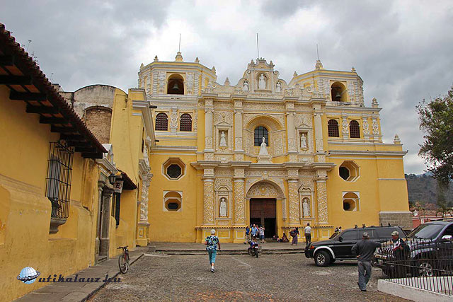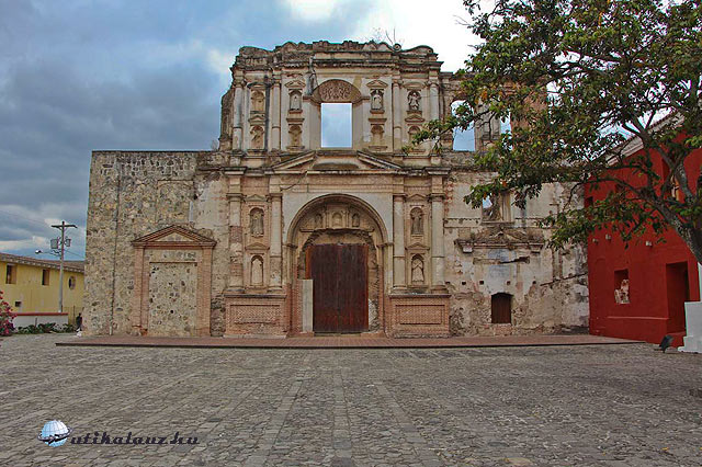 Mi jobbra fordulunk, elhagyjuk a St. Katalin kolostort, az utca végén pedig feltűnik a park a Merced templommal illetve kolostorral. Tiszta, rendezett s a templom lépcsőjén egy helyi kis gyermekes asszony árulja portékáit. Talán Antigua legszebb temploma, 1548-ban épült, s szintén összeomlott az 1773-as földrengésben. A restaurált sárga-fehér homlokzata talán a legszebb példája az antiguai barokk stílusnak.