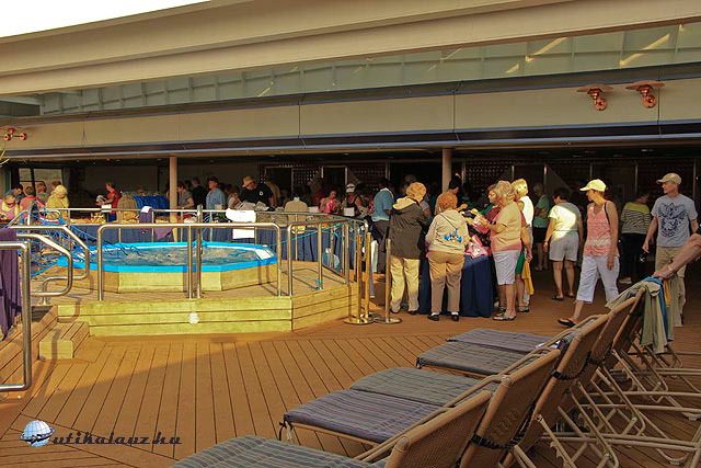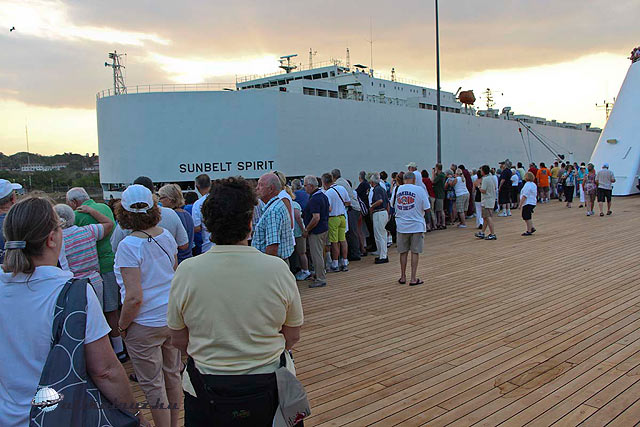 A 6. emeleten a hajót körbe lehet járni, négy kör éppen egy mérföld. Az idő kellemes, persze ahogy haladunk délre, a nedvesség úgy nő és a szellő nem nagyon ellensúlyozza a növekvő nedvességet.