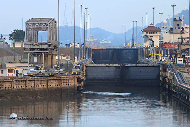 A tó túlsó végén a három-lépcsös Gatun zsilipeken keresztül leereszkedünk, a Karib tenger szintjére.
