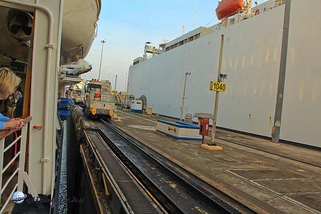 A Miraflores zsilip előtt megállunk, mindkét oldalon 3-3 mozdonyhoz csatolnak s megvárjuk míg az alsó csatorna vízszintje kiegyenlitödik a Csendes-óceánéval. Ekkor a zsilipkapu megnyílik és hajónk az első kamrába halad. A kapu becsukódik mögöttünk, a víz szintje emelkedik s mikor kiegyenlitödik a második kamráéval, megnyílnak az előttünk levő kapuk. Máris indulunk a második kamrába s a folyamat megismétlődik. A hátsó kapuk bezáródnak a víz szintje ismét emelkedik s mire a Miraflores tóval egy szinten vagyunk megnyílnak az előttünk levő kapuk. A Miraflores tónál a csatorna mindkét oldalán dombok jelennek meg, közeledünk a Pedro Miguel zsiliphez mely után a Gatun-tavon hajózunk. Pontosan 26 m-rel vagyunk a tengerszint felett. Az útnak ez a része, az úgy nevezett Culebra-vágás, megépítése adta a legnagyobb gondot a csatorna megépítésénél. Agyagos föld, s a meredek falak gyakran beszakadtak főleg az esős időszakban. Mi is láttunk egy pár beomlott partot s a kotrógépek állandóan dolgoznak ezek kijavításán. Jobb oldalunkon lassan megjelenik a Chagres folyó, mely a tó vízszükségletének nagy részét szolgáltatja. A Gatun zsilip előtt bal oldalon egy kis csatorna, az francia csatorna próbálkozás megmaradt emléke.