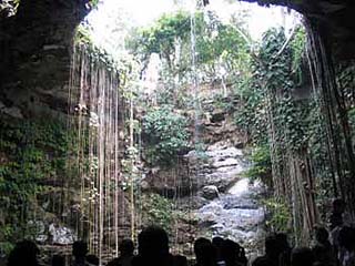 Mielott Chichen Itzaba ertunk volna, utba ejtettunk meg egy lenyugozo latnivalot. Egy Ikkil nevu helyen, a dzsungel kozepen van egy hatalmas… hat, talan a viznyelo a legjobb kifejezes. Kepzelj el egy kutat a meszko alapkozetben (a talajreteg csak par 10cm, alatta minden meszko). De ez a kut vagy 50-60m atmeroju es a vizszint is kb. ilyen melyen kezdodik csak. Cenote /szenóte/ amugy ezeknek a kepzodmenynek a becsuletes neve – legalabbis spanyolul. Az oserdo ‘tulcsordul’ a peremukon, a fak hatalmas gyokerei lelognak egesz a vizfelszinig, itt-ott a falat is eltakarjak a kulonbozo kuszonovenyek es kozben a peremrol 2-3 patakocskabol folyik/porlik le a viz. Csodalatos latvany!! A felszini vizfolyasok nagyon ritkak -ezen kivul nem is lattunk sehol! A meszko elnyel minden vizet, ami aztan fold alatti folyokban egyesul es pl. ilyen cenotekben valik itt-ott lathatova. Itt a szikla belsejeben vajtak egy lepcsot, amin le lehetett ereszkedni a vizszintig, sot akar furodni is lehetett benne!