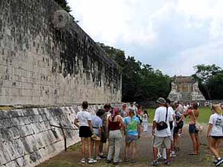 Megneztunk egy hires labdajatek udvart is, ami a maja vilag legnagyobb ilyeten epitmenye. Csak itt Chichen Itzaban van beloluk 7, de csak a legnagyobbra jutott ido. Ez asszem 80m hosszu volt es vmivel keskenyebb mint egy focipalya. A két hosszanti oldalon fuggoleges fal, kb. 2 emeletnyi magas, a rovid oldalakon nyitott. A falakon kozepen, a fal tetejen egy-egy kőgyűrű – mintha elforgatnank egy kosargyurut 90 fokkal. Na ezeken kellett atutni a labdat a 2 csapatnak. Nem lehetett egy konnyu mutatvany, leven hogy a labda tomor gumi volt, rugni nem is lehetett, olyan sulya volt. Utot hasznaltak hozza, a falon levo diszes faragasok tanusaga szerint még terdvedot is hordtak jatek kozben. Hogy mennyire nem volt konnyu dolog atutni a falon a labdat, jol jellemzi, hogy akar hetekig is eltarthattak a jatekok!!! Hogy mi volt a gyozes jutalma? Haat… Ez ugyben kicsit tanacstalan vagyok, ugyanis az idegenvezetoinktol es az utikonyvekbol is hallottunk/olvastunk egymasnak ellentmondo dolgokat. ‘A’ verzio: a vesztest lefejeztek (ezt a modszert ajanlanam az MLSZ figyelmebe is…), ‘B’ verzio: a gyoztest fejeztek le. A hallottak, olvasottak alapjan ugy sejtem ez a verzio lehet az igazi. Hogy akkor mi volt a motivacio? Ez nagyon nagy megtiszteltetes volt, ugyanis azok a majak akik igy haltak meg, kozvetlenul a ‘maja menyorszagba’ jutottak. A tobbieknek viszont halaluk utan 13 kulonbozo isten 1-1 kerdesere kellett valaszolni es csak ketszer lehetett hibazni. Aki nem nyert, az ‘ujra jatszhatott’, visszakerult a foldi letbe.:)