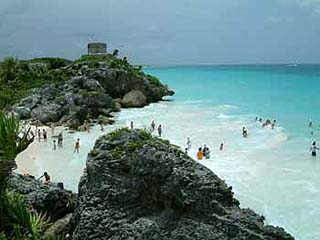 Masnapra, 26-ara csak egy felnapos programunk volt, Tulum. Ez is egy maja romvaros. Kulonlegessege nem annyira az ott levo epuletek szepsegeben, hanem inkabb azok fekveseben rejlik. Ez az egyetlen maja romvaros, ami a tengerparton fekszik. Reggel miutan a busz elindult a szokasos helyrol, még vagy 20 percig kanyargott egy – nem jut eszembe jobb kifejezes – luxus-getton keresztul (Playacar a neve amugy), hogy a kulonbozo sok csillagos hotelekbol felvegye még az utasokat. A mi kis gyonyoru El Doradonk olyan volt ezekhez kepest, hogy itt talan a hatso a udvaraban turtek volna csak meg! Es ilyenek sorakoztak egy egesz varosresznyi teruleten keresztul! Az uttest diszkőből, itt-ott golfpalyak az út mellett (azert az erdekes lehet, mikor elkap egy autot egy golflabda!:) ), gyonyoruen gondozott zoldteruletek, miegymas…