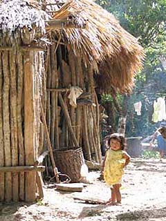 A haz korul ugy 30-50m-es korben kiirtva az erdo (az oslakosok az egyeduliek akikenek szabad), rajta csenevesz konyhakerti novenyek, elszaradt kukorica. Nem lehet egy halas dolog itt kerteszkedni, a meszkorol hamar lekopik az egy-ket arasznyi talaj. Ahol gyakrabban jarnak, ott nincs is mar mas, csak a csupasz kovek. Pont olyan hatast kelt, mint amikor egy epitkezes utan ottmarad az ossze-vissza megkotott beton, meg mindenfele belegyogyult epitesi tormelek. Namost a gyerekek ezen ugy szaladgalnak mezitlab, mintha vmi golfpazsit lenne! Tehat 8-an laktak abban a hazikoban. A 6-8 gyerek az atlagos!