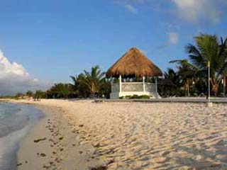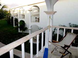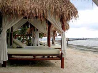 A recepcio kulonallo epuletben volt; egy hagyomanyos, videki mexikoi stilusu szep epulet, ahol igazan kedvesen es a honlap igeretenek megfeleloen pezsgovel fogadtak minket. Egyikunk sincs oda a pezsgoert, de akkor nagyon jol esett! 🙂 A villak kicsit tavolabb, a parttal parhuzamosan, egymas mellett, de lakreszenkent egymashoz kepest kicsit elcsusztatva alltak, cikk-cakk format alkotva. Es viragok, palmak, egzotikus novenyek MINDENHOL!!! A mi villank ugy 40-50m-re volt a viztol; emeleti keco, az erkelyrol pompas ralatas a tengerre. Egy szoba, benne nagy franciaagy, asztal-szekekkel, TV, legkondi, fesulkodoasztal, szef, mosdo kicsit eldugva, ill. sajat furdoszoba. Az az egy talan nem volt annyira elegans, mint a hotel amugy, de ez boven belefert – 3 napi nem furdes utan foleg:) Az erkelyen volt egy fuggoagy es ket nagyon kenyelmes nyugagy is.
