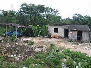 Kozben, a mar emlitett viszonylag alacsony fakbol allo dzsungelen keresztul vitt a nem tul szeles ut. Idegenvezetonk igazan lelkiismeretes es jol felkeszult volt. Majd’ egesz uton csak beszelt es beszelt a majakrol, az orszag tortenelmerol, mindennapi eletrol, erdekessegekrol. Az ut aprocska es szemlatomast nagyon szegeny falvak kozott vezetett. A tengerparti szuk sáv nem nagyon veszes, de elég csak egesz kicsit beljebb menni a szarazfold felé. A modosabb hazak fala vakolatlan blokkteglabol, a tobbie csuklo vastagsagu, egyenes faoszlopokbol allt es nad vagy katranypapirteto boritotta. Nalunk a legcsorobbak is kulonb helyen laknak. De parabolaantenna bezzeg volt! 🙂 Voltak persze kicsit rendesebb falvak is, de nem az volt a jellemzo. Hozza kell tenni, hogy a colop falnak sem csak a szegenyseg az oka, egeszen gyakorlati okai is vannak. Osszel, amikor a hurrikanok szezonja van, ha jon egy, akkor az az ilyen szellos falon egyszeruen csak atfuj, esetleg elviszi a tetot, de maga a haz allva marad!