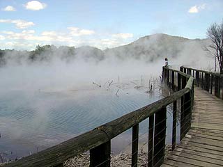 Rotoruában megint összefutottunk az ausztrál barátainkkal és a hétvége egy részét együtt töltöttük, beindult a közös főzés és a helyi borok kóstolása. Megismertük az első magyarokat is, akik történetesen a hostelünkben dolgoztak. Rotorua, avagy a bűzváros, egy szuper jól elhelyezett, gejzírek övezte termál-paradicsom. A városban mászkálva mindenhol gőzfelhőket lehet látni, ami néha elég kellemetlen kénes szaggal jár, és mindenfele (ilyen-olyan víz, iszap) fürdőzési lehetőség van. Mint általában, szinte mindenki sportol valamit. Van egy óriási tó a város szélén, közel a tenger, szuper kiránduló utak vannak és rengeteg mountain bike pálya (nemrég volt itt a vb). Ja, és láttunk hatalmas importált californiai fenyőket a Redwoods erdőben.