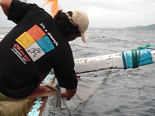 Aztán jött az első reggel (általában csak a napfelkeltekor mennek ki) 4.30-kor kiléptem a víztől 20 méterre található bungalóból, és irány a koromsötét tenger. Első körben letettünk 200 méter hálót makrélára. Azért sötétben mert ilyenkor nem látja a makréla és beleúszik :