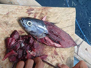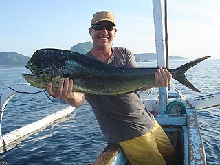 Hirtelen csak annyit érzel, hogy kicsit nehezebb lett a zsinór, majd indul a játék. A tettes egy 10 kg körüli mahi mahi volt, ami gyorsan kiderült, mivel kb. 2 m magasra kiugrott a vízből a csónaktól vagy 50 m-re. Kb. 10 perc múlva aztán megszelidült, és be tudtuk emelni a hajótestbe. Önfeledten nevettünk.