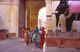 Az erőd jellegzetessége, hogy lakott és elég lerobbant állapotban van. Szemben a többi erőddel, amit meglátogattunk, amelyek műemlékek és ha az ember túljutott az kapu előtti árus/guide/koldús tömegen, akkor bent már nyugodtan tud nézelődni, itt végig zaklatásnak vagy kitéve. Az erőd kapujához felvezető út mellett árusok és zenészek, akik valamilyen rejtélyes okból kifolyólag a ‘Sur le pont d’Avignon’ című francia népdalt nyekergetik, kissé idegtépő. Meleg van, baktatunk felfelé, 4 kapun kell átjutni, mire beléphetünk az erődbe, romos házak szegélyezik az utat, az egyiken Cyber Café felirat. Épphogy össze nem dől. Tehenek, kutyák, kócos kisgyerekek. Mahavir beterel minket egy jain templomkomplexumba. Cipőt le, mászunk felfelé a meredek lépcsőkön. Azon nyomban mellénk szegődik egy szimpatikus fiatalember, jain pap, persze ő se kér semmit, csak szeretne minket beavatni a jain vallás rejtelmeibe. Na jó, ha ehhez van neki kedve, miért ne. Még mindig palira tudnak venni. A templom fantasztikusan gyönyörű, hihetetlenek ezek a faragások. Körbejárjuk alul az oltárt, felmegyünk az emeleti részbe, itt ér utol minket egy szent ember, aki füstölőt árul, az ebből befolyó pénz a templomé lesz. Na üsse kavics, veszünk tőle egy dobozzal. Majdnem dobunk egy hátast, amikor 150 rupiát kér érte, feszülten figyelik a reakciónkat, végül nem szólunk egy szót sem, kifizetjük. A templomot átjáró köti össze egy másik jain templommal, átmegyünk oda is, ez kisebb de itt is tobzódnak a faragások, lefényképezünk egy ruhába öltöztetett istent. Vége a látogatásnak, indulunk kifelé. Kísérőnk megállít, hogy ha tetszett a vezetés, akkor ne fogjuk vissza magunkat, nem sértődik meg, ha adunk neki egy kis pénzt. Kedvesen mosolyogva közöljük vele, hogy ő pap és nem idegenvezető és ő ragaszkodott ahhoz, hogy vezessen minket, majd otthagyjuk. Az utolsó csepp a cipőőrző pasi, aki követeli a 10 rúpiáját, mert vigyázott a cipőnkre. Nem akarjuk érteni, hogy mit mond, de elkezdi Attilát a karjánál fogva rángatni és üvölt, hogy ide a zsozsót. Kisebb feltűnést keltünk, a hangulat nem barátságos. Fizetünk, de ettől kezdve vagy szatyorba tesszük a cipőnket és úgy megyünk be a templomokba, vagy felváltva és egyikünk a cipő mellett marad és nem engedi senkinek, hogy hozzányúljon. Ez a mi sekélyes kis bosszúnk.