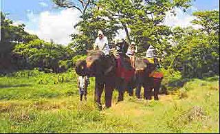 Kis fotózás a helyszínen, majd újabb szerzeményeinktől diadalittasan indulunk tovább, mégpedig elefánt-szafárizni. 40-50 perces száguldás után fékezünk egy bódénál, ahol két elefánt vár minket. Kandula, aki 28 éves fiú, és Mónika(?), aki fiatalabb és lány. A felszállás külön élmény: a helyi fa oldalán van egy 1m2-es terasz, ahova falépcső vezet fel. Elefántunk fejjel beáll a terasz alá, mi pedig rásétálunk a hátára, majd leülünk az oda rögzített ketrecbe. Menetiránynak oldalt ülünk mind a négyen, lábunk lelóg az elefánt oldalán, szebbik felünket masszírozza az állat háta. Kicsit gyanús, hogy a hajcsár nem ül fel, sőt a elefánt mögött sétál. Mi van, ha elszalad velünk? Szerencsére nem szalad, sőt kimondottan komótos tempóban ballagunk a lápos területen.