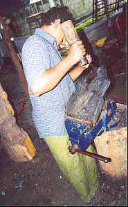fákról, az ébenről, királyébenről, mahagóniról, rózsafáról, teak-ról, kókuszról, jack-fáról, meg egyebekről. Megtudjuk, hogy az ébenfának nem a teljes törzse fekete, csak a teljes átmérő kb 1/3-a ilyen, a többi cseresznyepirosra érik, ha megmunkálják. A királyében azért különös, mert feketeségében halvány barnával látszik az erezet is. Faragás közben mindkettő olyan, mintha keménygumit faragna az ember. Elénk tesznek egy pohár forró vizet, amibe a mester valamilyen fűrészport szór, ettől a víz rubinvörössé válik. Utána citromot facsar bele a jóember, a piros szín minden átmenet nélkül citromsárgára vált (eközben még mindig kristálytiszta, üveges), majd amikor meszet kever bele a faragó, püspöklilára vált a szín. Az ezzel festett tárgyak mellesleg sokkal szebbek, mint a Trinát zománcra hasonlító agresszív és rikító „modern” festékek. A bemutató után persze vásárlási lehetőség, ahol potom 1800 dollárért haza is hoznák nekünk a 60cm magas ébenfa elefántot. Kihagyjuk.