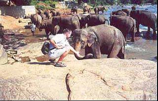 Elnézegetjük, ahogy fürdenek, közben fotózok, simogatjuk őket, aztán amikor bemennek a mély vízbe fürdeni (hogy fér el egy térdigérő vízben egy egész elefánt?!), akkor felülünk a teraszra és a hideg sör mellől vizsgáljuk az elefánt-kérdést. Délután 4 órakor aztán jön két 50 kilós emberke, akik a 65 elefántot egy hangos szó nélkül felterelik a karámjukba. Az érdekes csupán annyi, hogy az elefántok a kitelepült árusok között vonulnak el, mégsem borítanak fel semmilyen állványt. Így aztán sikerül elefántos Sri Lankás pólót is venni.