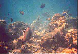 lépcsőjénél bevonuló búvár választhat, hogy a sekély (1,8-3m), homokos fenék felett úszkál, vagy kimegy a mélyebb (10+ m) vízre. Szerintem a határon érdekes mozogni, a másfélórás nézelődés (csak pipával, nem palackkal) alatt látok vagy 40 féle (!) halfajt. Csodásak a színek, megunhatatlan a víz alatti világ. A halakból hihetetlen sok van, látótávolságon belül van mindig legalább 20-30 darab, a közvetlenebbek akár 20cm biztonsági távolságot tartanak, a bizalmatlanabbakat nehéz 2m-nél jobban megközelíteni. Mint később kiderült, mindezt bármelyik napszakban megnézheti az ember, nem kell különös szerencse a halak megtekintéséhez.