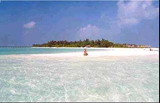 Ellenőriznünk kell, ezek-e a mi csomagjaink? Igen, erre berakják egy légkondis mikrobuszba, és arrébb megyünk vagy kétperces sétára való távolságnyit. Megérkeztünk, behozzák a bőröndjeinket, elfoglaljuk szállásunkat Sun Islandon. A sziget az Ari-atoll déli részén helyezkedik el, 300km-nyire vagyunk az Egyenlítőtől. Kb. 3-400 méter széles és 1500-1600 méter széles a sziget, legnagyobb magassága 2m tszf. A szigeten 400 kétszemélyes faház van, ebből kb. 80 db a víz felett áll cölöpökön, a többi a fehér homokos part melletti pálmafák között. Parti bungalót kaptunk, felszerelése teljes: TV, légkondi, ventillátor, minibár, széf, telefon, internet, saját zuhanyzó (a lefalazott saját minikertben), 2db 120x200cm-es ágy (összetolva) és DNY-ra néző saját tengerpart, a hozzá tartozó napozószékekkel.