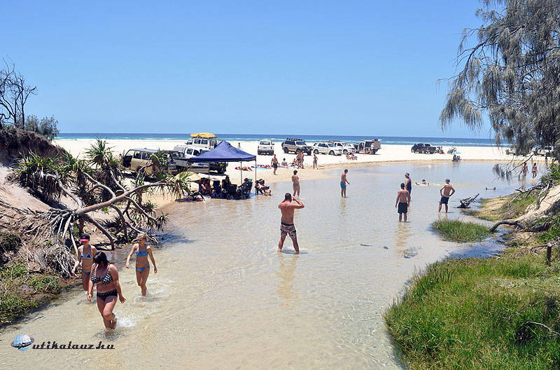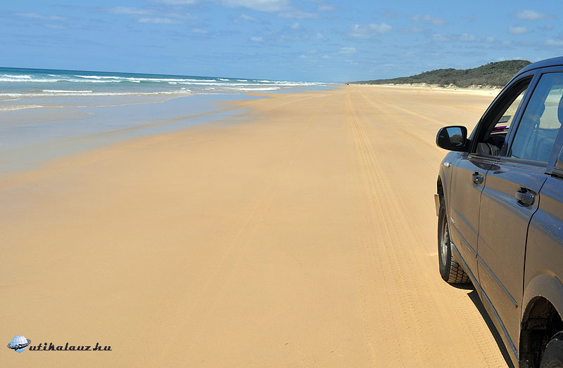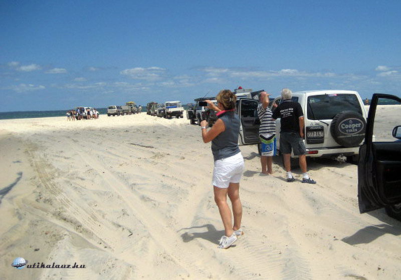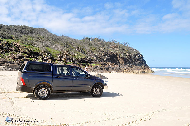 Ezúttal azonban a komp után nem a kényelmes autópályát választottuk, hanem a tengerparti utat amely egészen Noosa-ig vezetett. A kemény sima homokon élvezet hajtani, balra a Csendes óceán, jobbra homokfal magasodik. Itt csak kijelölt helyeken lehet kempingezni. Mi novemberben voltunk ott, ami ugye még csak késő-tavasz, de már sokan ott töltötték a hétvégét, akár sátrakban, akár minden kényelemmel felszerelt lakókocsikban.