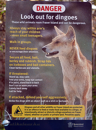 (Ez is egy utóbbi időben bevezetett biztonsági megoldás, mikor először voltunk itt, a régi jó Pálma gumimatracunk helyén reggel csak bélyegnyi cafatokat találtunk – a dingók rágóguminak használták). Mindenütt információs és figyelmeztető táblák. Mivel már kora délután volt, itt megettük az előre csomagolt szendvicseket és irány haza.