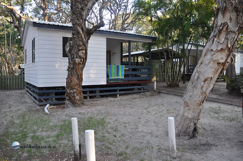 Rainbow Beach egy nagyon kellemes környezetben lévő bungalókból áll, nagyjából a sziget közepén. Van egy vegyesbolt, benzinkút és egy egyszerű étterem is. Mi egy három ágyas bungalót választottunk, komplett konyhával és a tornácon sütögetési lehetőséggel.