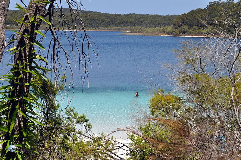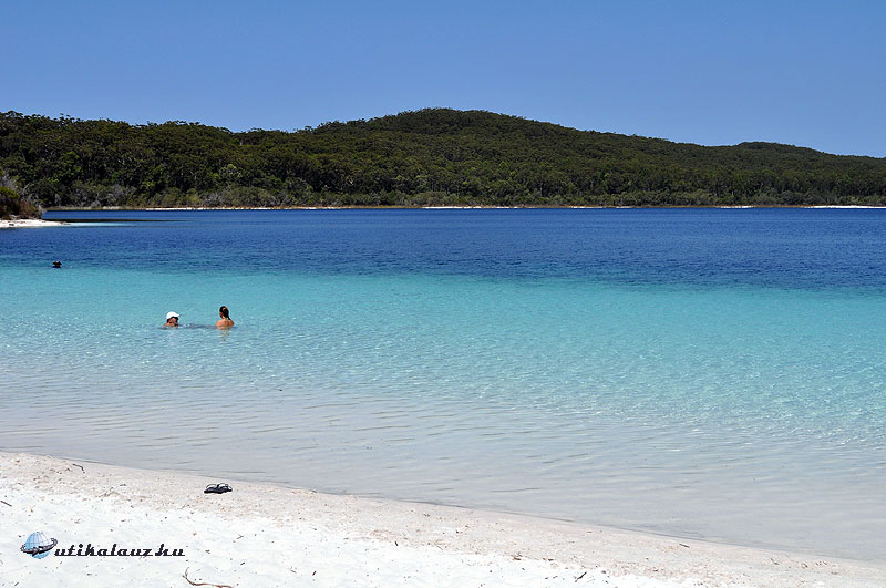 Innen átmentünk a Lake McKenzie-hez. Ez egy elég nagy tó, tiszta szilikát homokkal. A víz nagyon kellemes meleg és nagyon-nagyon tiszta. Jó sokat üldögéltünk, beszélgettünk a térdig érő vízben, de aki úszni akar, át is úszhatja a tavat.