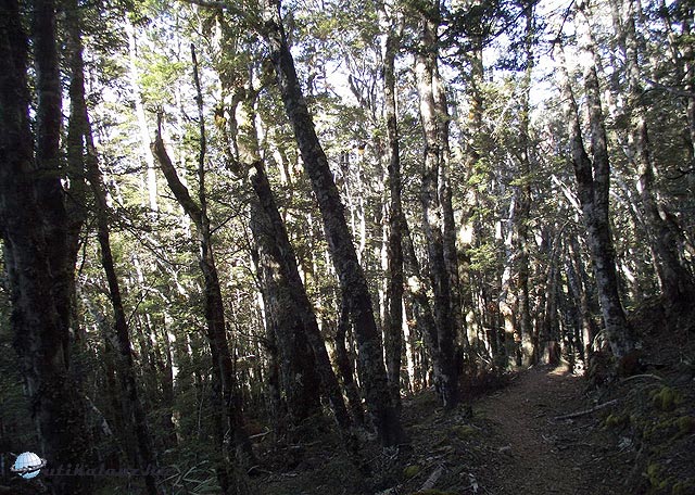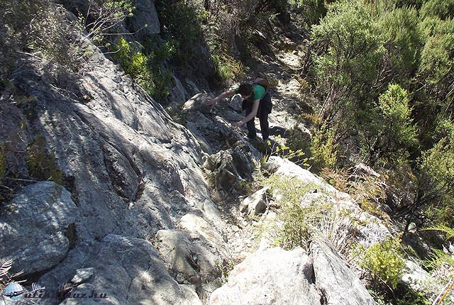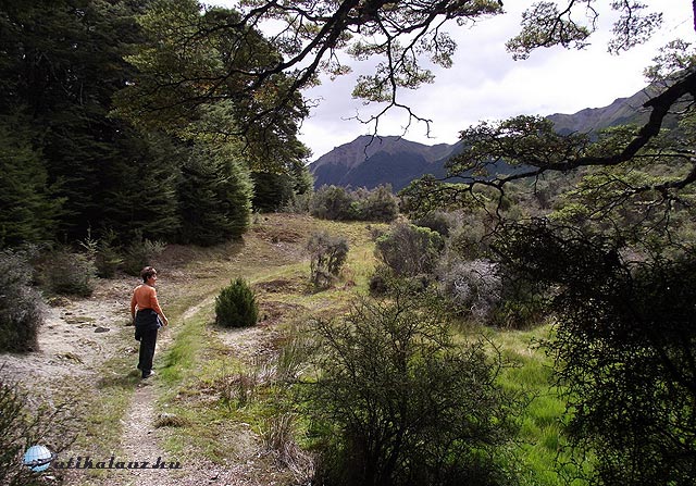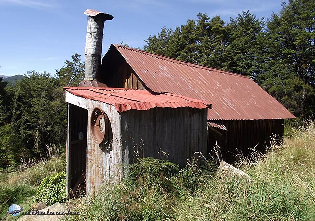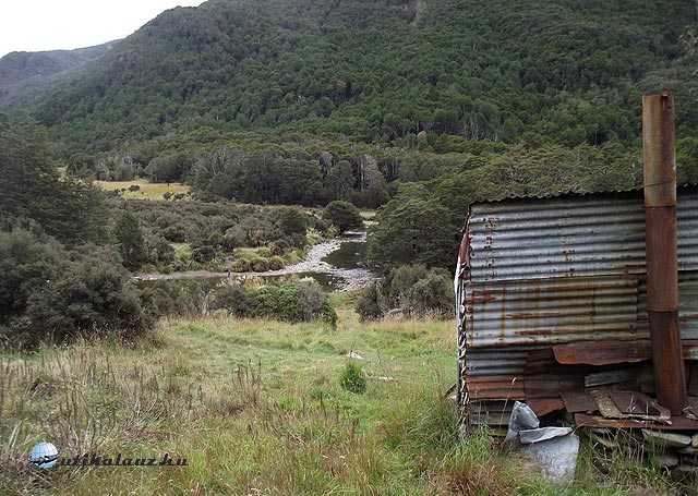 Ezen az úton nem volt szintkülönbség, egy patak mellett haldtunk, a Gyűrűk Urá-ban látott erdőben. Embernek nyoma se volt, ennek ellenére az út remekül ki volt jelölve, eltévedni szinte lehetetlen. Kb. két óra kényelmes séta után egy “turistaházhoz” érkeztünk, Chaffey’s kabinjához. Ez egy igen elhanyagolt egyszobás (2×2 m) kabin, melyet már átadtak az enyészetnek. Szükség esetén meg lehet húzódni benne.