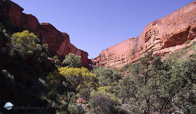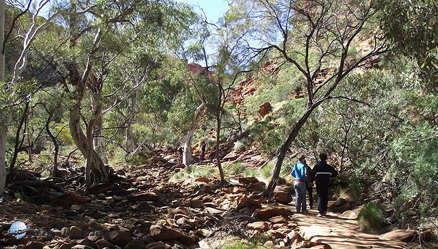 A következő látványosság a kb. 300 kilométerre – ami itt nem távolság – fekvő Kings-kanyon volt, ami egy King nevű telepesről kapta a nevét. A Lasseter autóútról a Luritja útra fordultunk (itt az autóutakat nem számozzák, hanem az utcákhoz hasonlóan nevezik el), de a csak a Kings-kanyon resort-ig tudtunk menni, ahonnan szigorúan csak terepjárókat engednek tovább, azoknak is áthajtási engedélyt kell kérni. Ennek megfelelően elég nagy kerülőket kellett megtennünk.