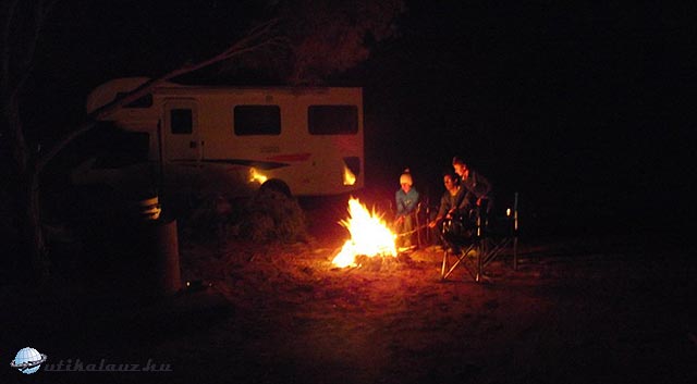Mint ilyenkor szokásos, nagy tüzet raktunk. A tűzifa nem kérdés, húsz lépésnyi séta után hegyekben állnak az elszáradt bokrok, cserjék. Jó magyarok lévén természetesen szalonnát sütöttünk. A lassan kialvó tűz mellett felragyogtak a csillagok. Az egész területen csak két másik kocsi állt le, természetesen tisztes távolságban. Kinyitottunk egy üveg bort és hátradőltünk a székekben. Ahogy sötétedett, úgy nőtt a csillagok száma. Minden zavaró fény kihúnyt… nem mindennapi élmény volt, sok városi ember egész életében nem lát ilyet. Az országúton néha-néha elhúzott egy un. road-train. Ezek a hatalmas kamionok 3-4 utánfutót húznak és este úgy tűnik mintha egy karácsonyfa száguldana el melletted.